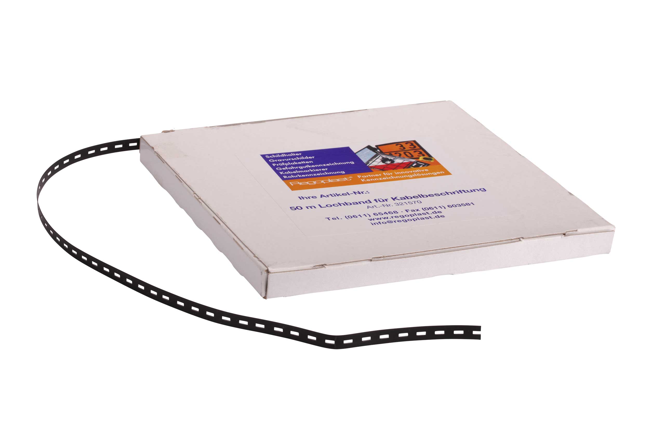 50 m Lochband (in Kassette) aus Polyamid. 7,6 x 0,5 mm.