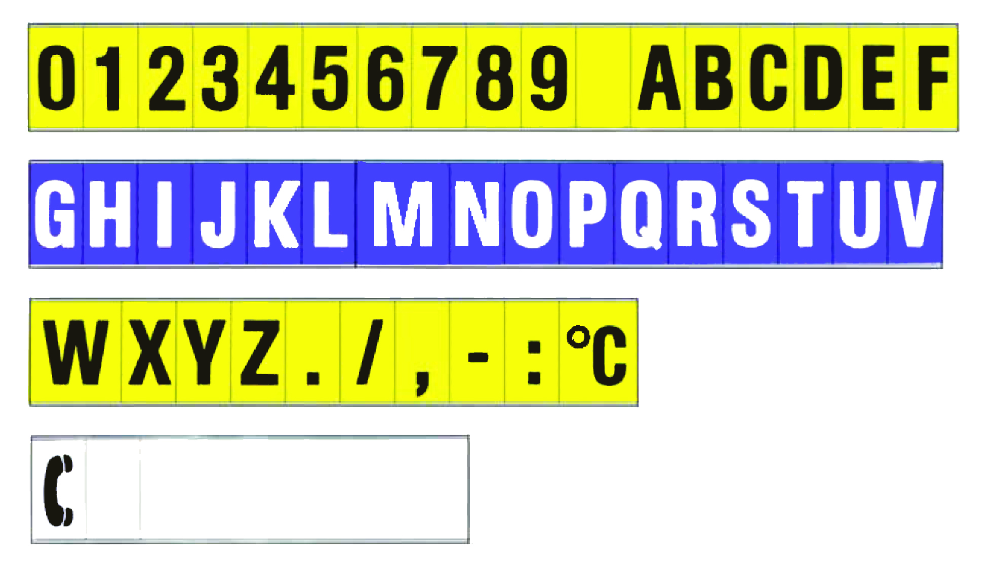 0-9 / A-Z, Schrägstrich, Punkt, Bindestrich, Komma, Doppelpunkt, Telefonsymbol, leer, °C